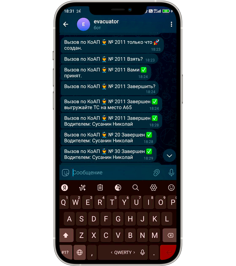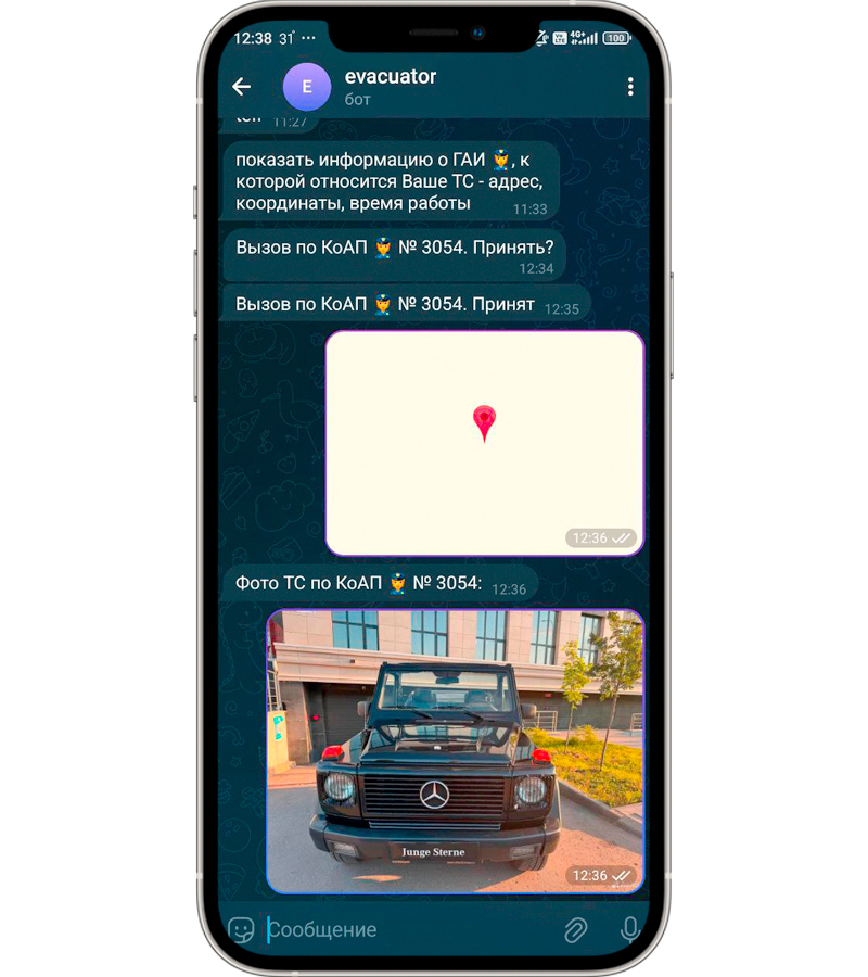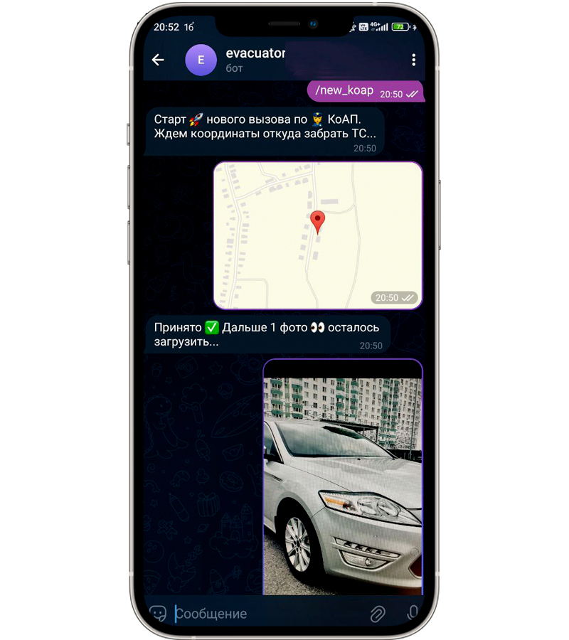 Не нужно звонить или писать. Можно голосом в бот скинуть адрес и описание ТС, которое нужно эвакуировать. И система сама переведет адрес в координаты для вызова и из описания сформирует карточку ТС: ГРЗ, марка, модель, цвет и прочее.